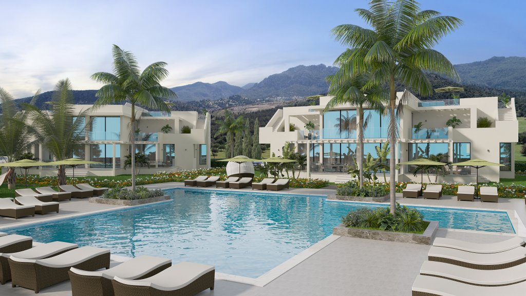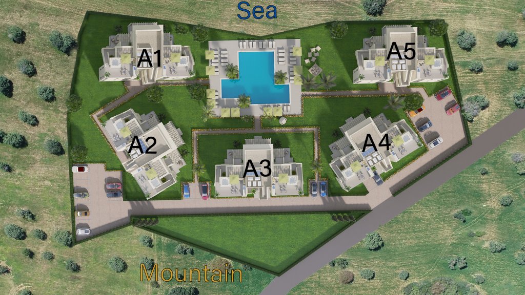 There are only 5 apartment blocks sharing a communal swimming pool, sunbathing terraces and green areas. There will be a car park for each apartment.