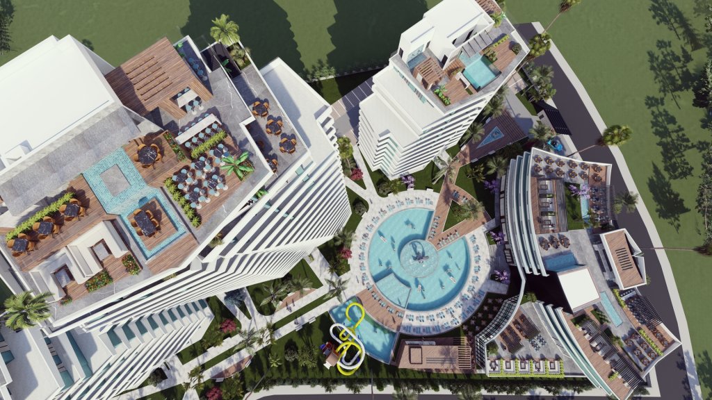 The advantage of the project is among the social and lifestyle facilities providing high quality of service, relaxation and walking areas, aqua park, 2 children's pools & 4 adult's pool alternatives, a gym where you can integrate your daily life with health and sports, 2 restaurants, one is a la carte, a pool bar and a terrace bar, a multi-purpose amplifier to host various activities, parking at each block, mini golf and many purpose areas, playground, market, souvenir shop, beauty salon and ATMs, 24-hour site security system, indoor swimming pool, jacuzzi, sauna, massage room and Turkish bath will also serve the spa center for guests.