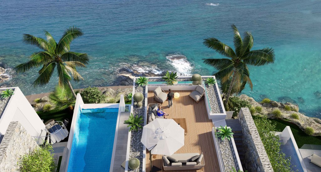 The centerpiece is its exclusive collection of eight villas in the front line, each strategically positioned at the edge of the rocky cliff. This placement creates a remarkable sensation of being directly on the sea, rather than observing it from a distance. The villas exhibit the appearance of single-floor bungalows when viewed from the private road at the back. However, beneath the living spaces and pool located at road level, the bedroom floors are ingeniously nestled, providing privacy and a serene ambiance. With three ensuite bedrooms boasting walk-in wardrobes, the villas open up to a lovely lower garden facing the sea, offering breathtaking views both inside and out. The crowning glory is the roof terrace, offering a 360-degree vantage point showcasing the majestic sea and mountains that adorn the backdrop.