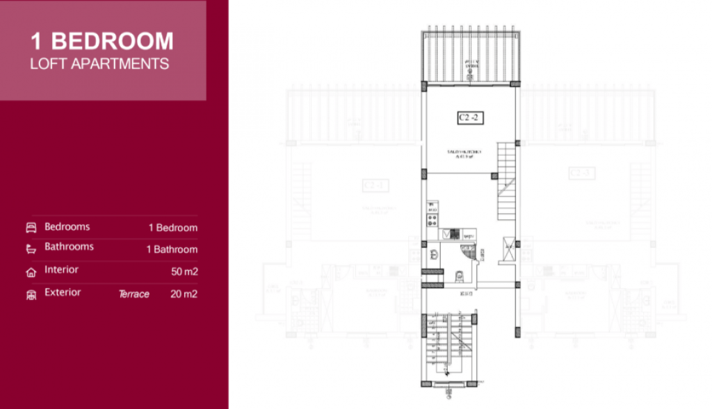 One bedroom apartments are offered in a choice of a garden apartment (with access to the private garden), a penthouse apartment (with access to the rooftop terrace) or a duplex (loft) apartment on the garden level.