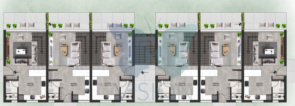 - 1+1 loft on the ground floor with a closed area of 63m2, a terrace of 10m2 and a private garden of 16-97m2;