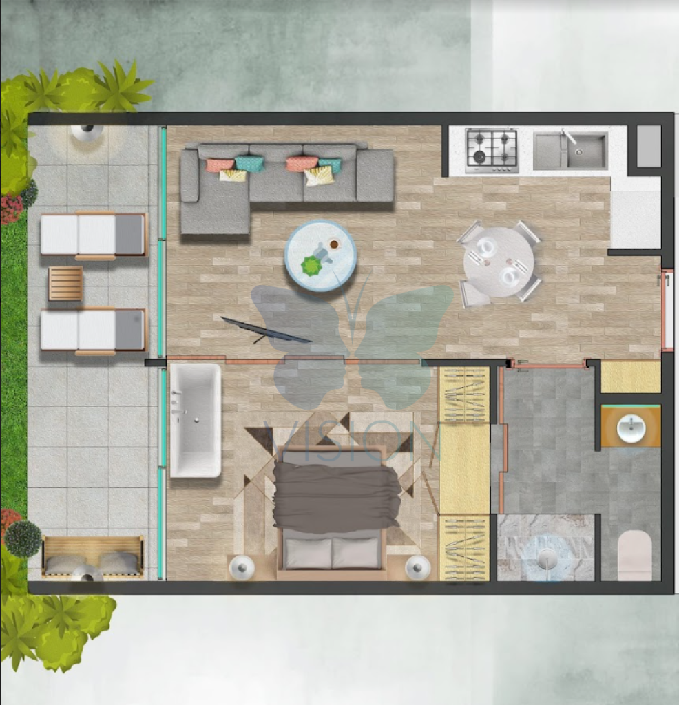 The concept of the project is READY TO MOVE. The price includes furniture and household appliances. Modern kitchen and bathrooms, Central air conditioning system and Card entry system.