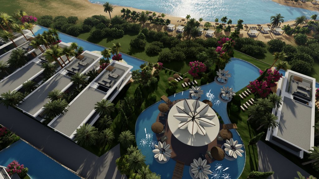 The Villas and Apartments are located on 80 hectares of land in Tatlisu close to Esentepe and Kyrenia. The project is close to many amenities and facilities such as restaurants, bars, shops all conveniently placed for your everyday needs. The project have also a nice sandy beach in the front. 800 meters and 6.5 km away are located 2 sister projects from same developer giving free access of usage of communal facilities for residents of this development.