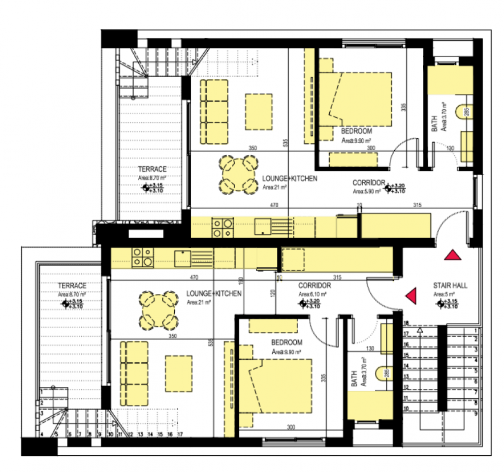 - Aluminium stair railings with natural marble flooring in common areas