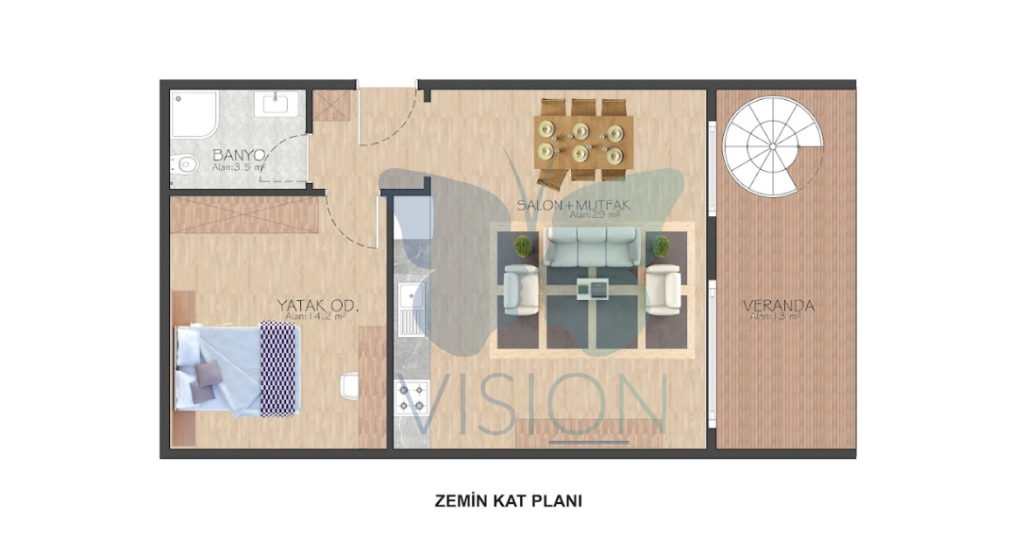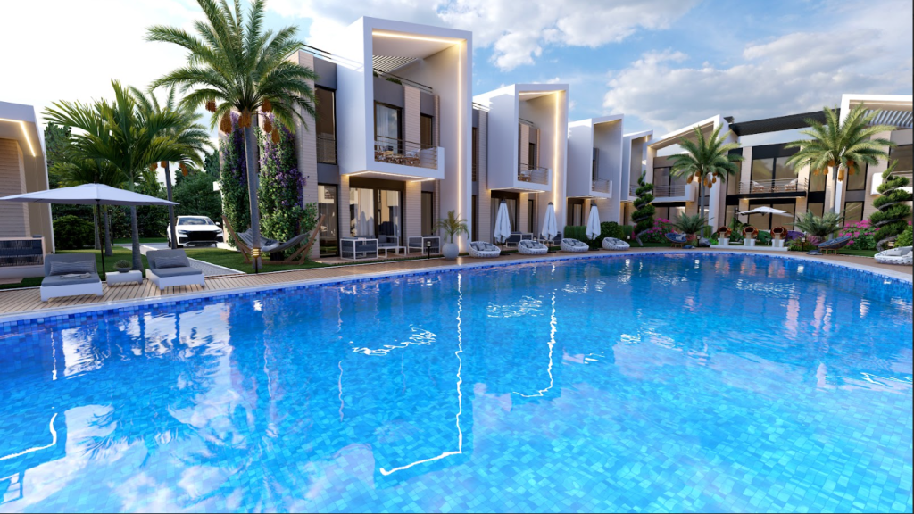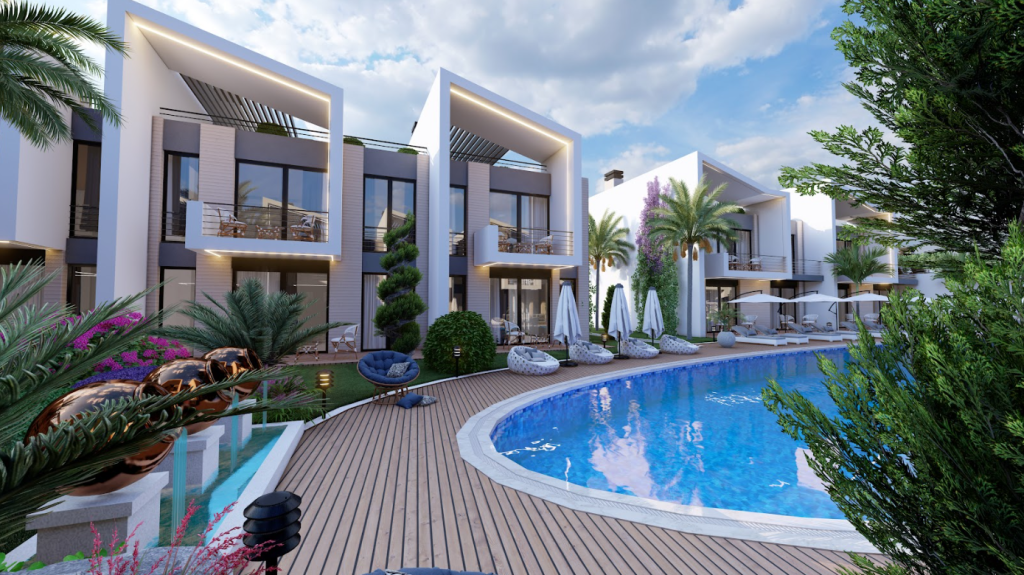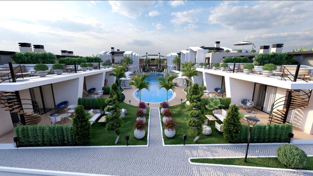 The project will consist of 29 apartment units which will be built around a communal swimming pool with landscaped design. The apartments are 1-bedroom or 2-bedroom depending on your choice and all come with a roof terrace. Luxury townhouses overlooking the Mediterranean Sea in Lapta, North Cyprus.