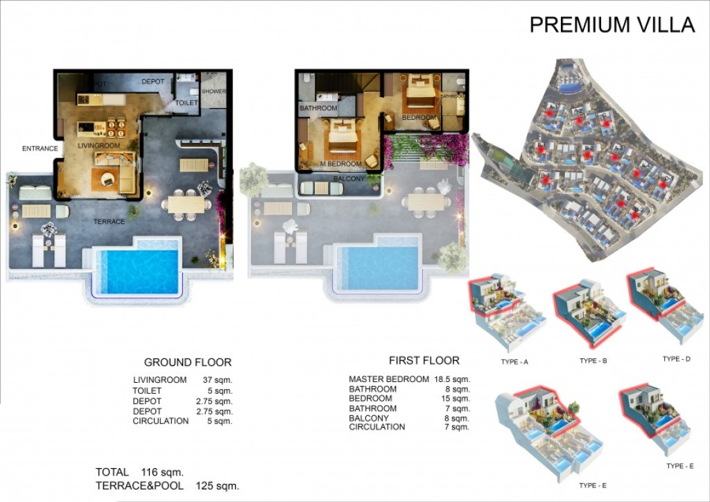 Each residence's infinity pool with its own sea view and spacious indoor and outdoor spaces are prepared for you by considering the high quality of materials and workmanship.