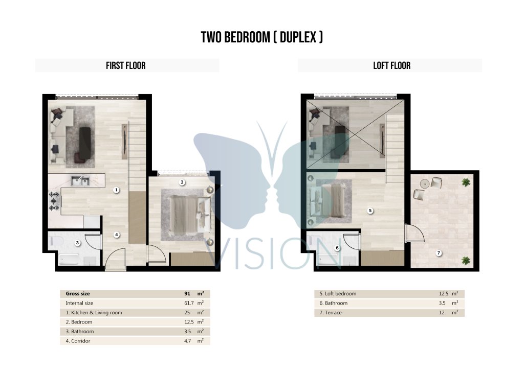 Two-bedroom duplexes, offering ample room for families or those who desire more space.