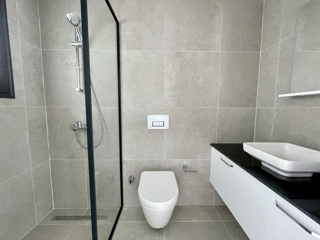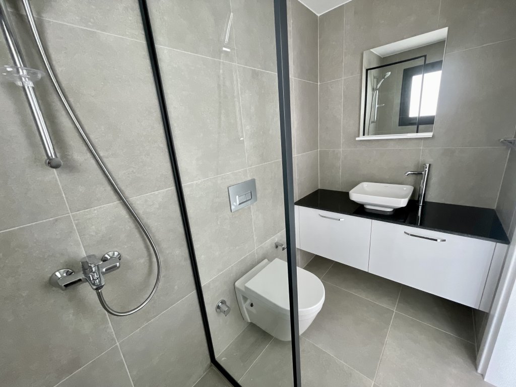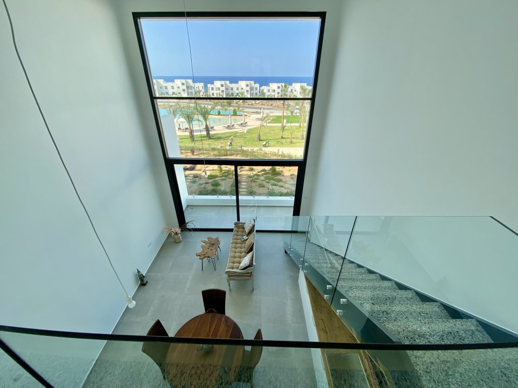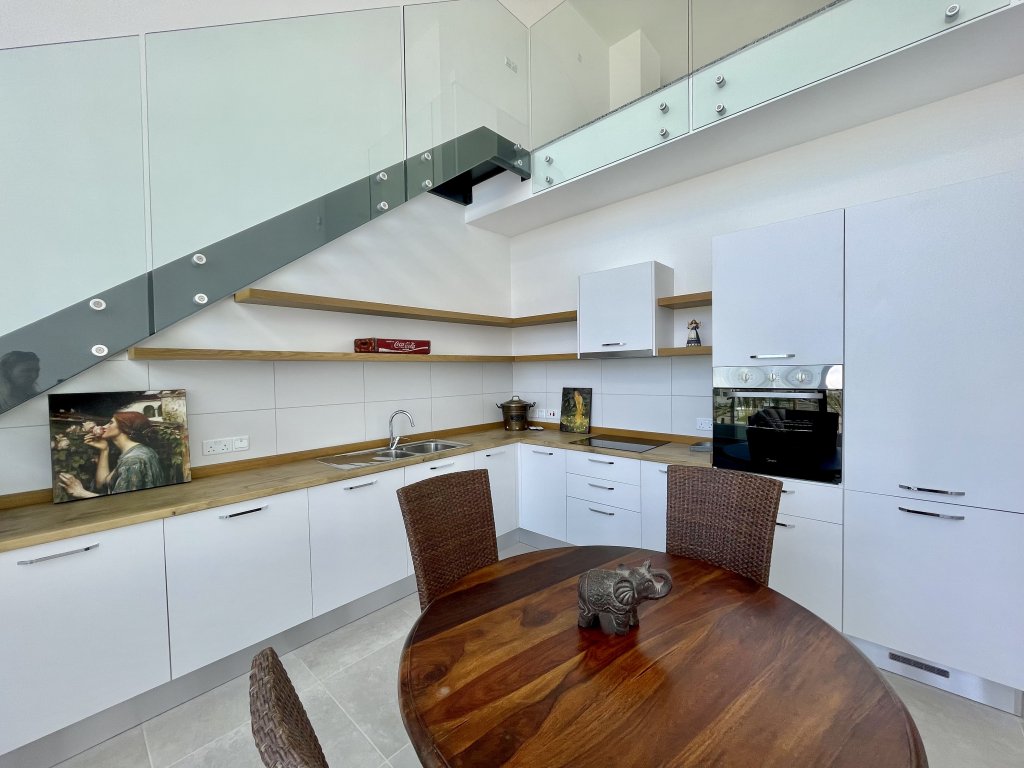 Upon entrance to the property, one has an amazing feel of space due to the double height ceiling in the lounge / kitchen area with access to a private terrace with a view. One of the bedrooms with a stunning mountain view is located on the same level, along with the guest shower/WC room and washing machine area.