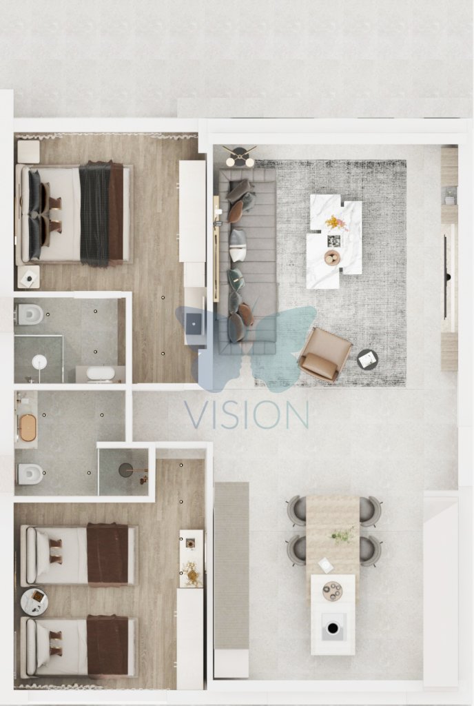Through expansive windows and spacious balconies, La Casalia's Deluxe 2+1 Apartment incorporates the stunning Mediterranean views, including its clear waters, vibrant greenery, and breathtaking sunsets. Each apartment is carefully crafted using high-quality materials, ensuring both practical and stylish living spaces, including kitchen and bathroom areas. The apartments are also equipped with smart home technologies, enhancing your comfort, security, and energy efficiency with eco-friendly design elements.