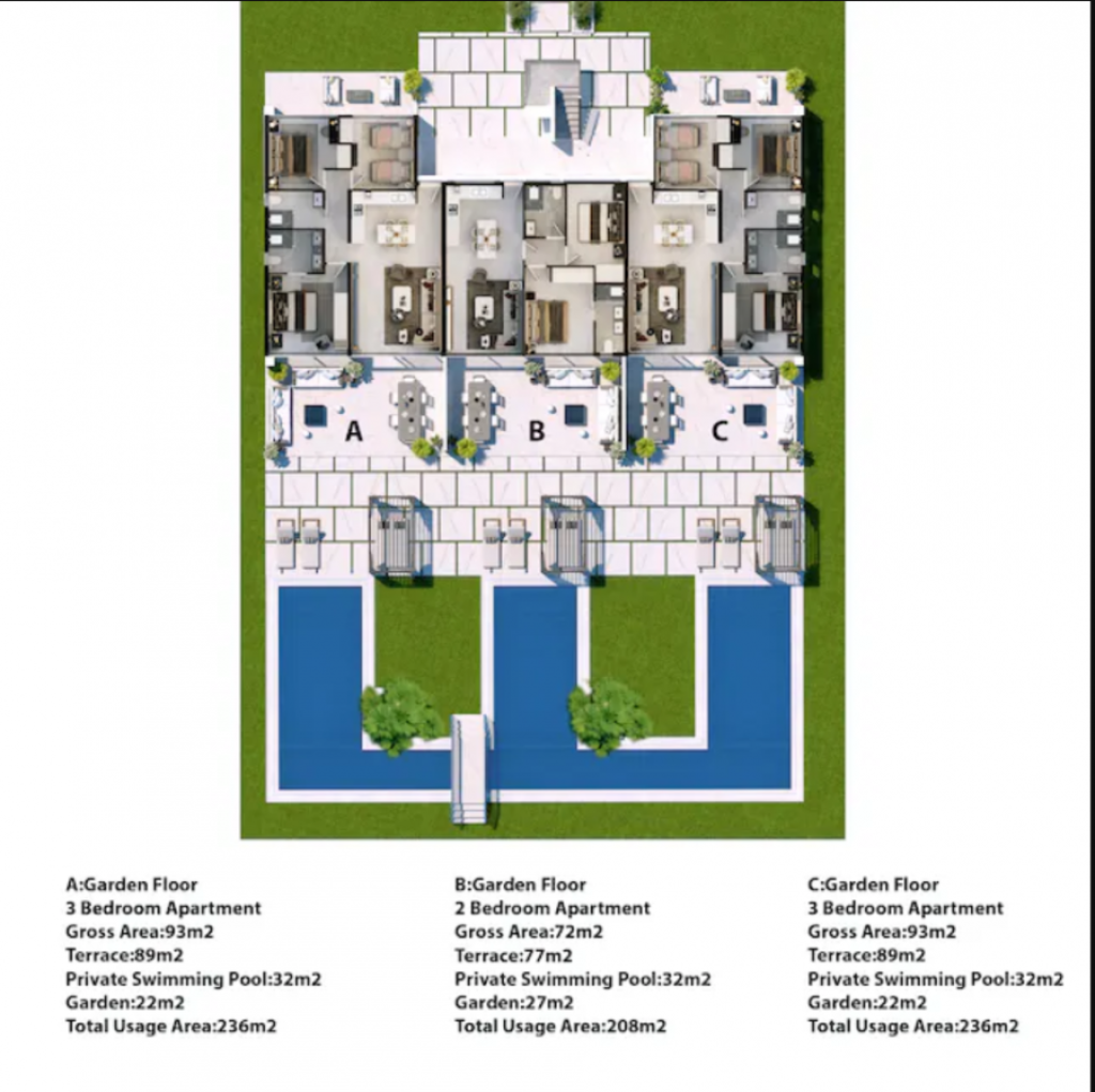 The project offers 2 and 3 bedroom residential units with private swimming pools and gardens and other facilities for the residents within its grounds to include tennis court, fitness area, children's play areas and more.
