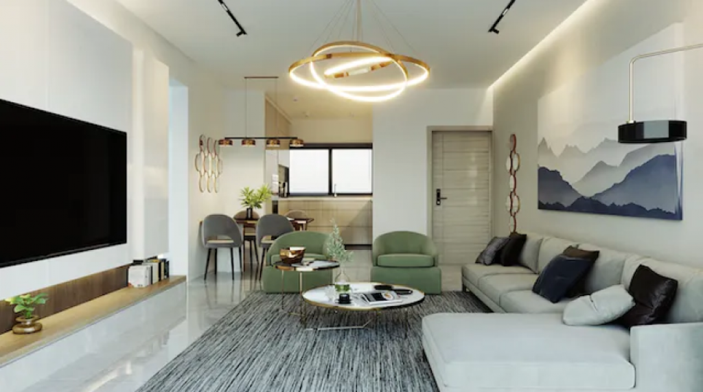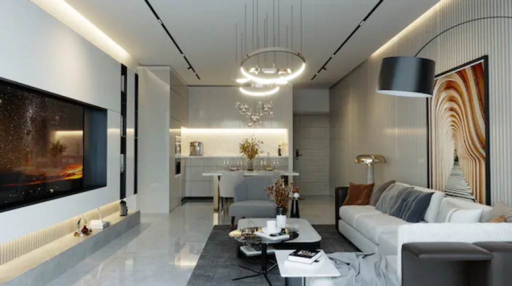 - Full height suspended ceiling with LED spot & strip lights in the living room
