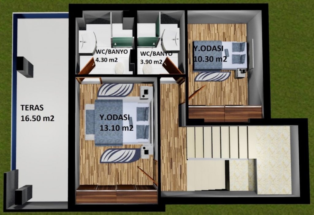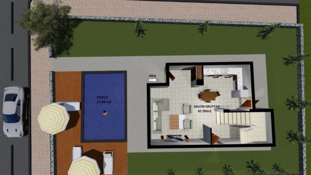 Opening to a spacious lliving room with double height ceiling, separately arranged kitchen with access to garden, the villa offers 3 bedrooms on upper floors and a spectacular rooftop terrace. The garage area can be turned into extra bedroom or a studio if required.