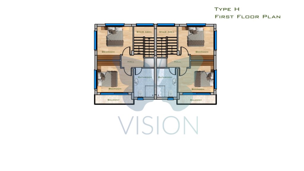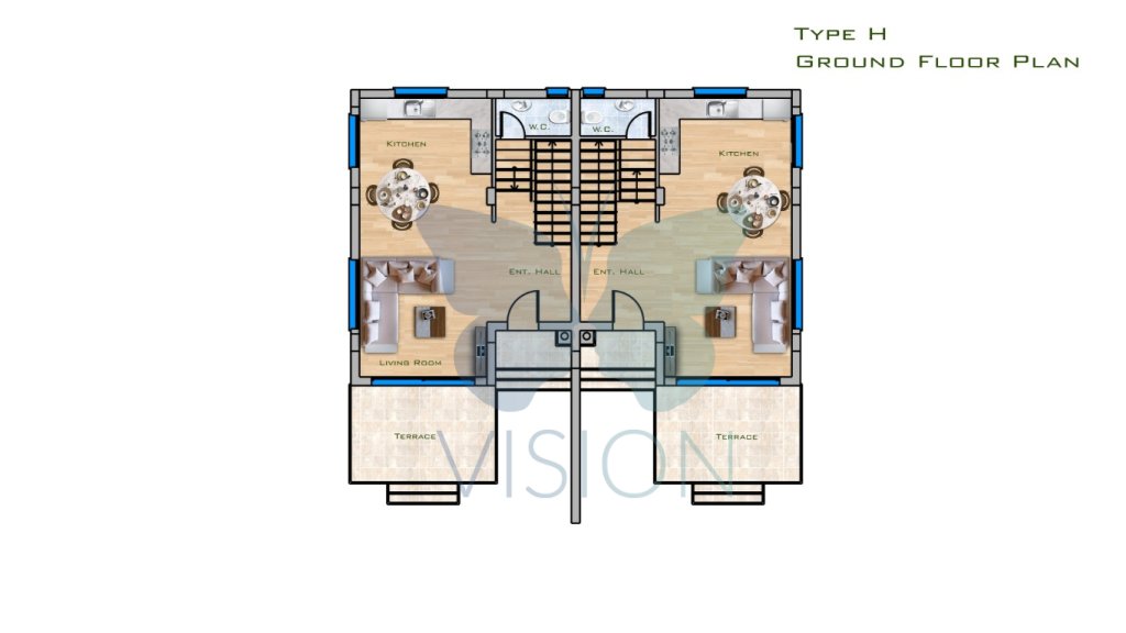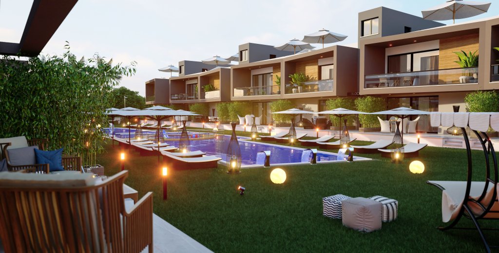 The complex comprises 28 units of 2+1 apartments, 6 units of 1+1 apartments, 4 units of 3+1 loft apartments, and 6 units of 2+1 semi-detached villas. Each unit is designed with the highest standards in mind, featuring a variety of quality floor and bathroom ceramic tiles, laminate, and WC and bathroom faience and accessories. The bathroom faience and WC are of Hilton standard, ensuring a luxurious feel. The kitchens are fitted with luxury appliances, and each bedroom comes with a fitted wardrobe and entrance cabinet. The units also feature aluminum double glazed windows, glass windows at the stairs, and an aluminum railing.