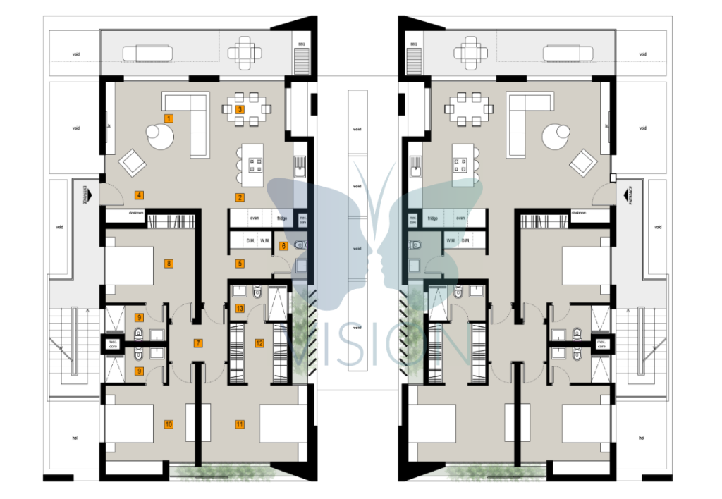 Type 2 Building: Hosting four luxurious apartments, this building includes two ground floor units and two penthouse apartments on the first floor. Access to the apartments is through a common area, fostering a sense of community while maintaining the hallmark of luxury.