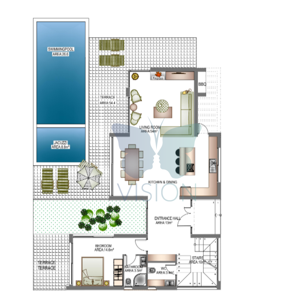 Velux also caters to your well-being with a suspended ceiling, central heating infrastructure, and an entrance steel door for added security. A cloakroom at the entrance offers a designated space to welcome guests, while the private pool invites you to relax and unwind in style.