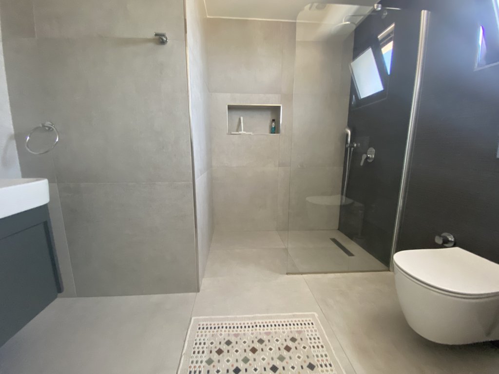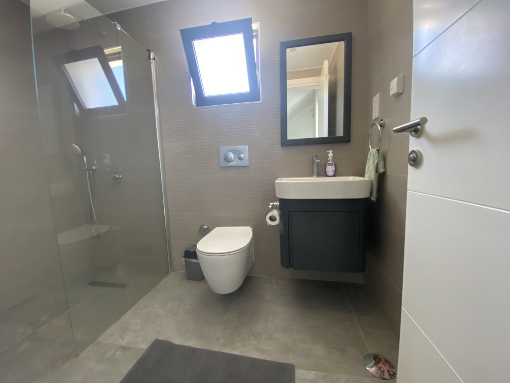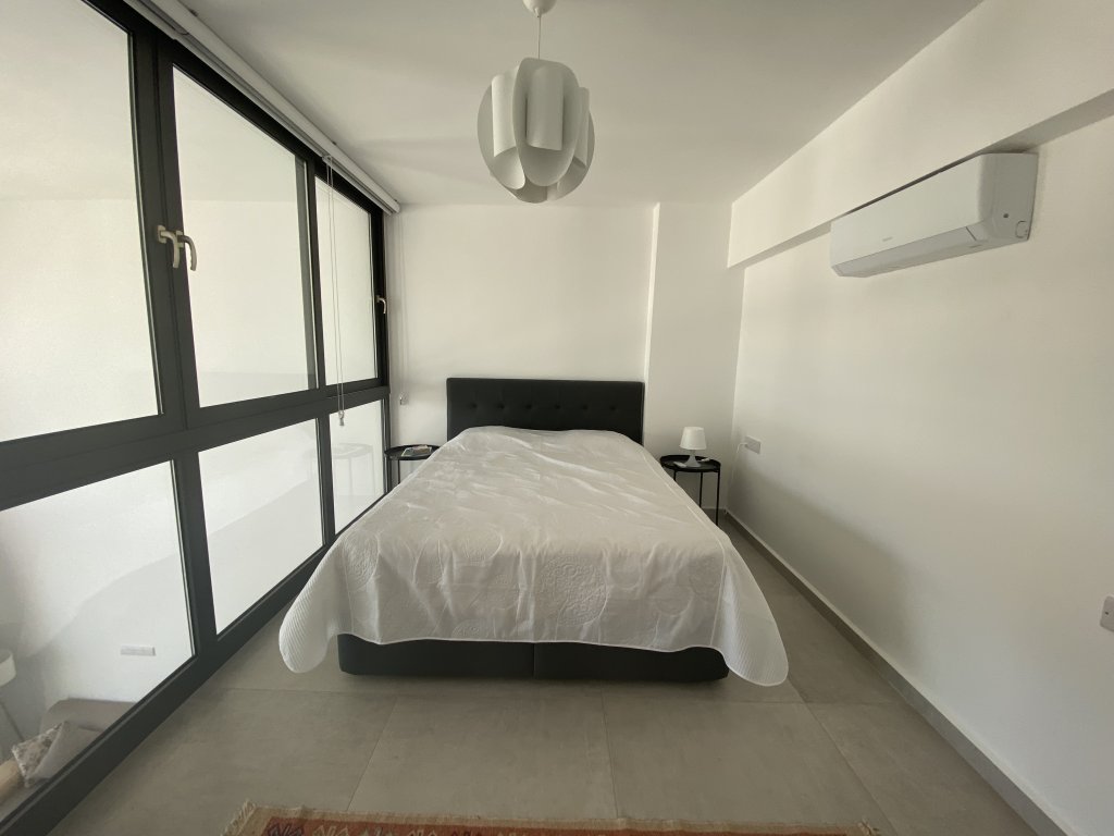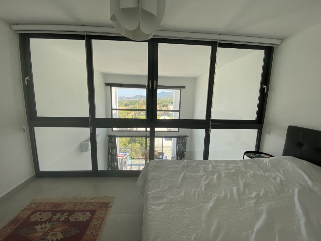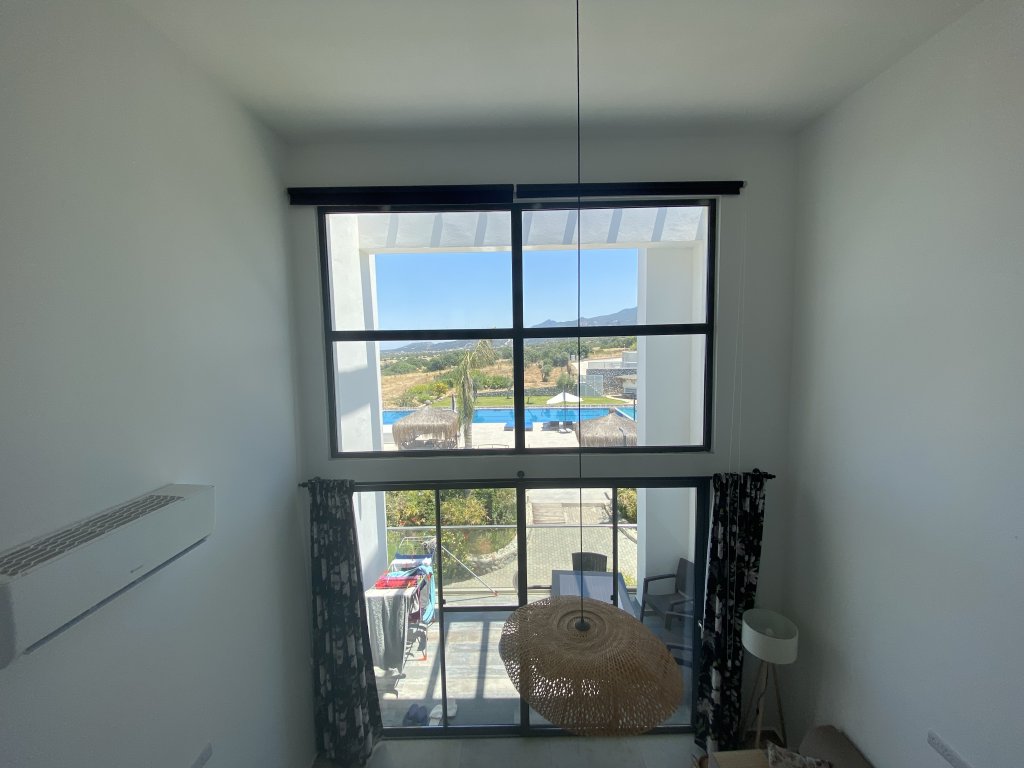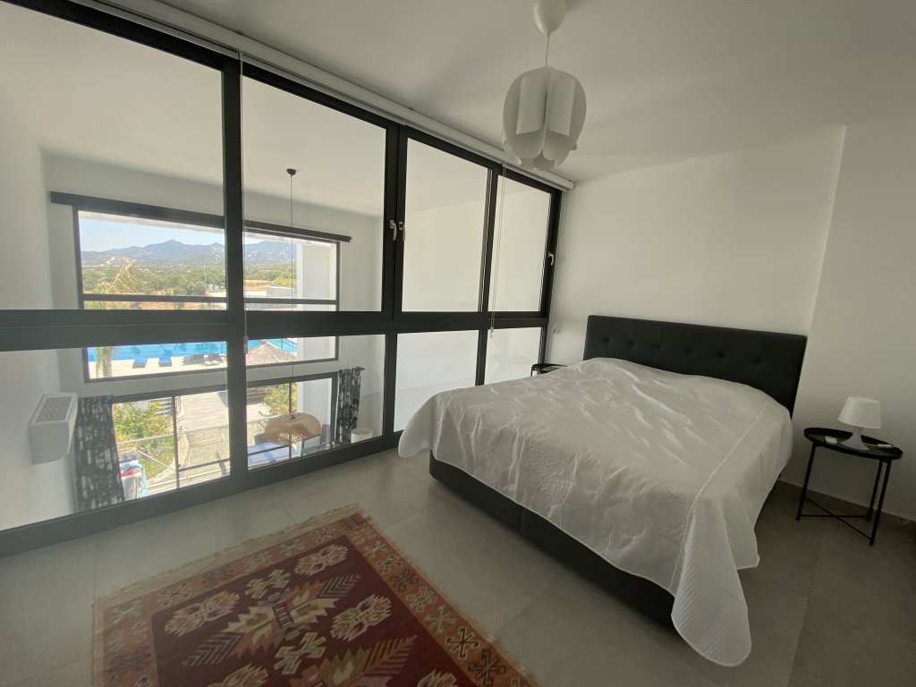 The bedroom with en-suite bathroom is located on the upper level and overlooks the lounge area. It has a dual aspect, enjoying both sea and mountain views. Property comes fully furnished and equipped.