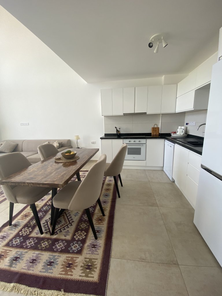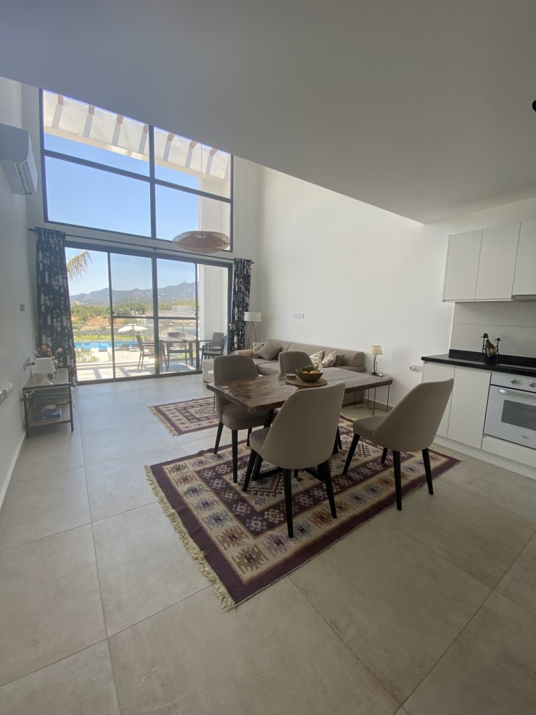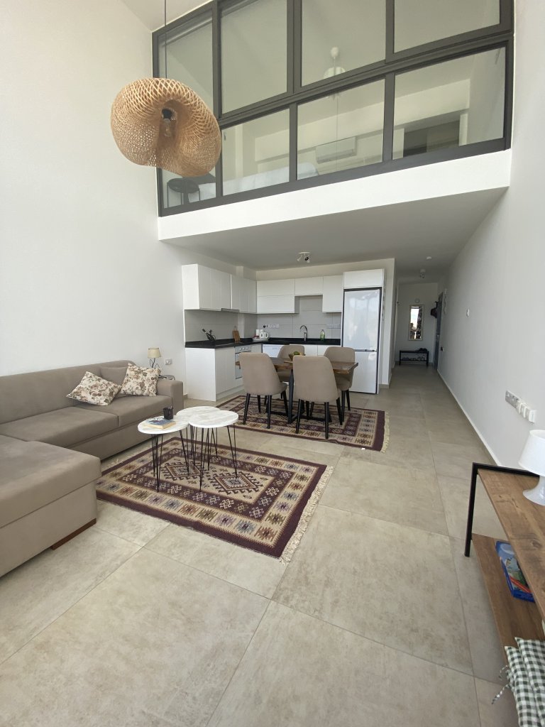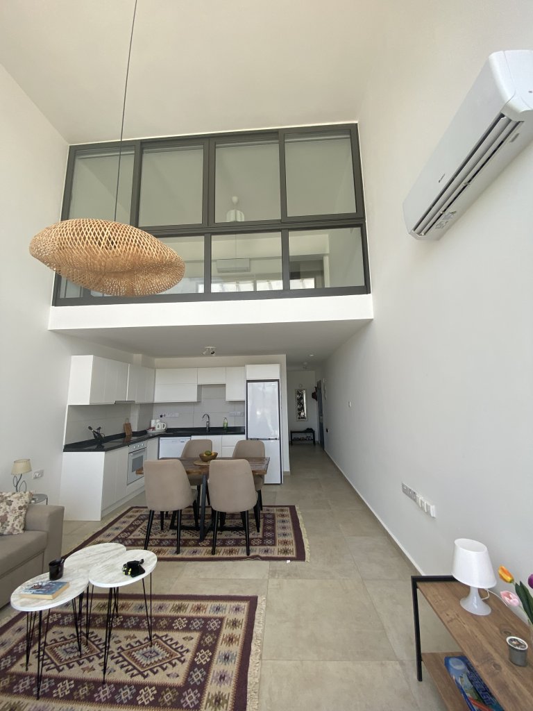 Property feautures 85 sqm of interior and 8,5 sqm of terrace. The apartment has a view to the oasis communal pool, nicely landscaped green areas and the Mediterranean. Upon entrance to the property, one has an amazing feel of space due to the double height ceiling in the lounge / kitchen area with access to a private terrace with a view. One of the bathrooms is located on the same level, along with washing machine area.