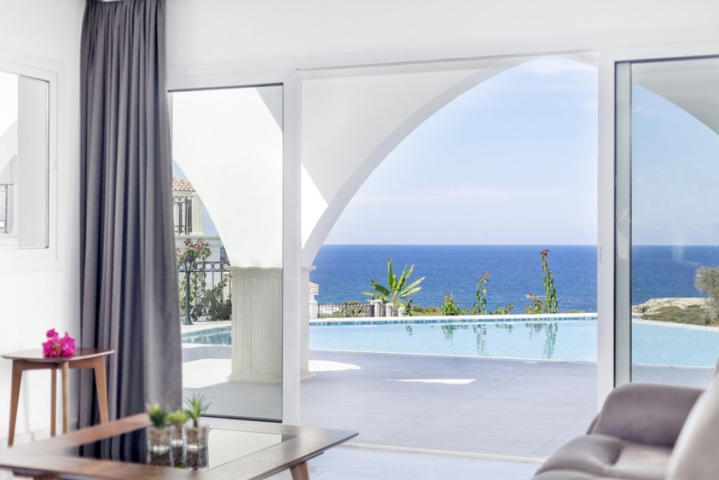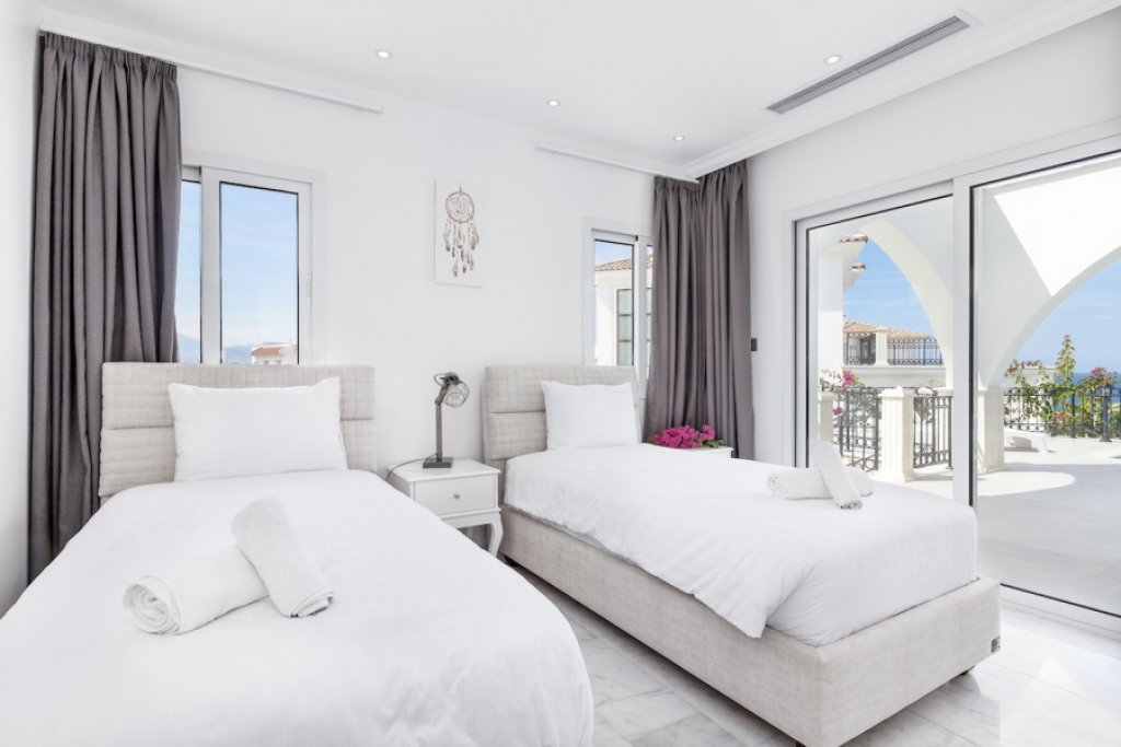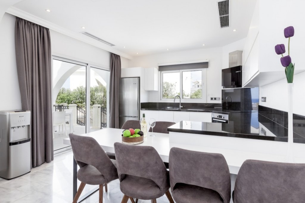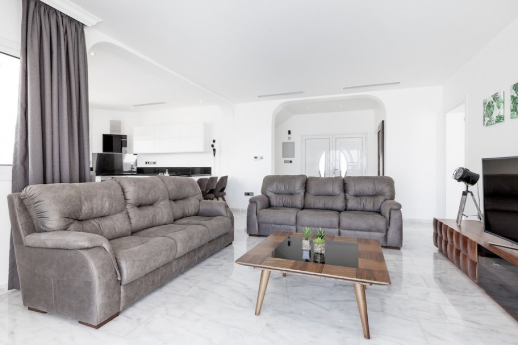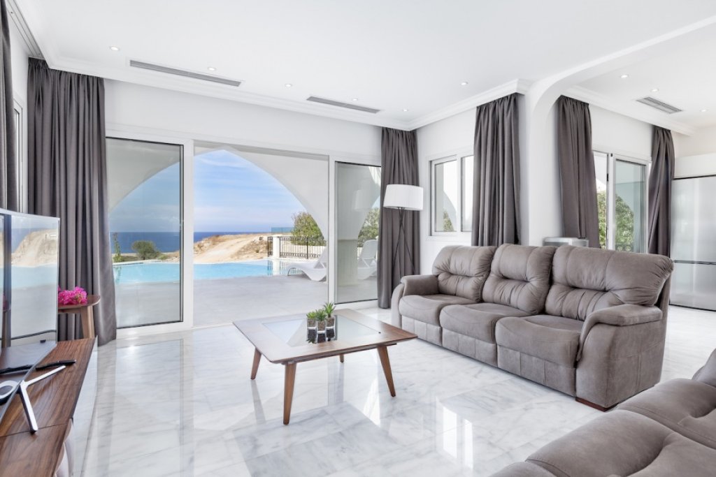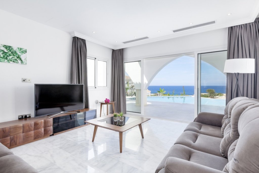 The villa offers spacious indoor and outdoor living space, fantastic terraces and landscaped garden with overfloow swimming pool enjoying the best views. Inside the property opens to a large open plan living room and kitchen with access to a spacious covered terrace overlooking the pool and the sea. One of the bedrooms with en-suite bathroom is located on the ground floor, while other 2 bedrooms (both with en-suite bathrooms) are on the upper level with even more open panoramic views.